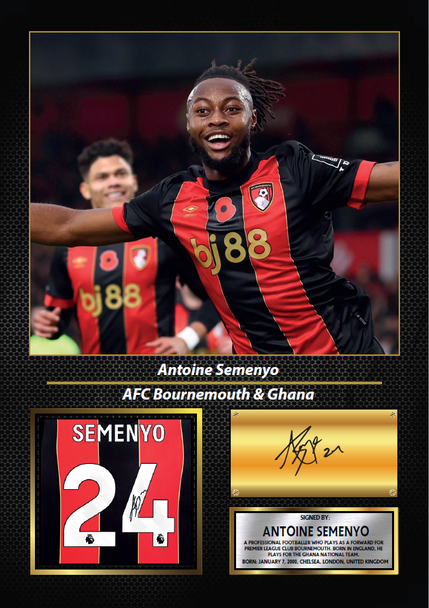 Celebrate the energy and international pride of Antoine Semenyo with this Printed Signed Poster, a dynamic tribute to the Premier League midfielder representing AFC Bournemouth and the Ghana national team. This collage-style print features Semenyo in full match action, framed alongside his jersey graphic, printed autograph, and a detailed bio plaque.