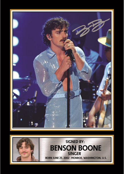 Celebrate the rising pop sensation Benson Boone with this striking portrait printed signed poster print. Featuring a dynamic on-stage performance image with dramatic lighting and stylish stage presence, this artwork captures the energy and emotion of a live concert moment.