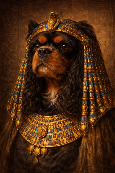 - Elegant Royal Pet Portrait – Beautiful combination of luxury and humour featuring a royal Cavalier-style dog portrait with detailed Egyptian ornaments.