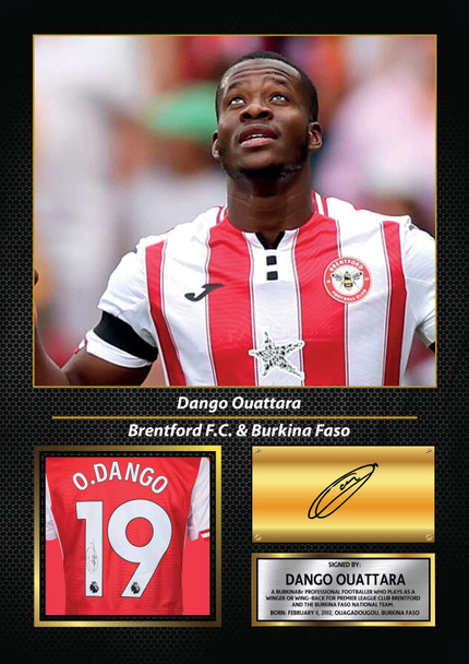 Celebrate the energy and versatility of Dango Ouattara with this Printed Signed Poster, a premium tribute to the Burkinabé winger and wing-back representing Brentford FC and the Burkina Faso national team. Captured in a focused moment on the pitch, this commemorative collage includes a framed jersey with his number 19, stylized autograph, and a detailed biographical plaque.