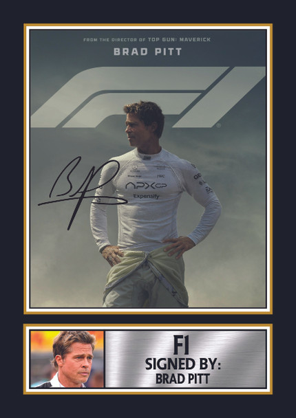 Celebrate the excitement of motorsport cinema with this F1 printed autograph poster featuring Brad Pitt in the highly anticipated Formula 1 racing film. The design captures the intensity and style of the racing world, making it a striking wall display for motorsport and movie fans.