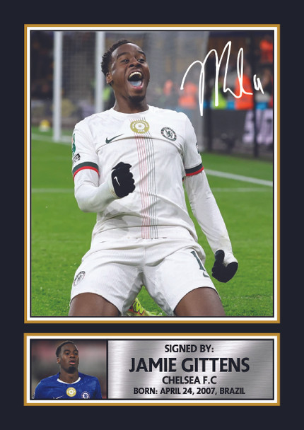 - Printed Autograph Design – Includes a printed signature-style autograph of Jamie Gittens integrated into the artwork to create the appearance of a signed collectible (not a real hand-signed autograph).
