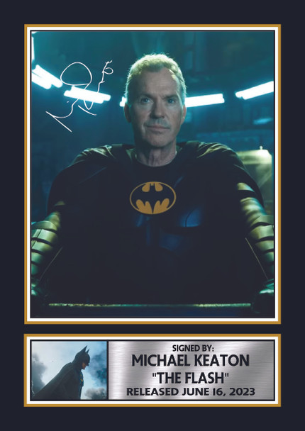 Celebrate the return of an iconic Dark Knight with this Michael Keaton The Flash (2023) printed autograph poster. Featuring a striking image of Michael Keaton reprising his legendary role as Batman, this design also includes a printed signature-style autograph and movie release details, giving it the look of a collectible memorabilia piece.
