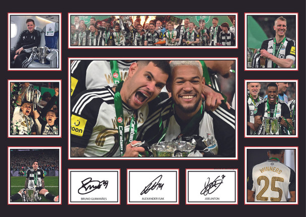 Newcastle United Champions Team 2025 Signed Poster Print – Carabao Cup Victory Collage – Autographed Wall Art Featuring Guimarães, Isak, Joelinton & Trophy Moments
