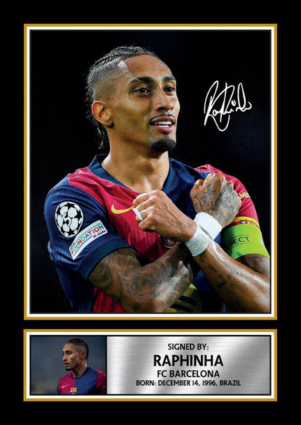 - Raphinha Autograph Poster: quality print featuring Raphinha with a digitally reproduced signature for fans and collectors.