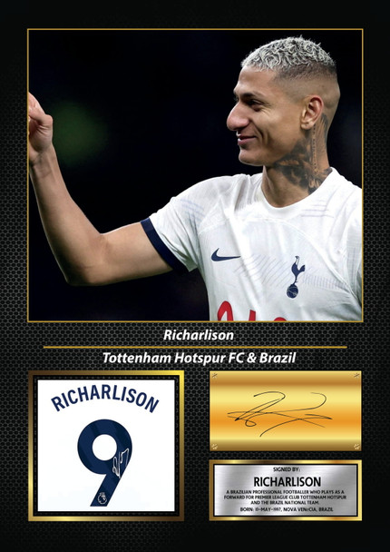 Richarlison Printed Signed Poster – Tottenham Hotspur FC & Brazil Forward Tribute Wall Art with Jersey & Bio Plaque – Premier League Football Memorabilia for Fans & Collectors