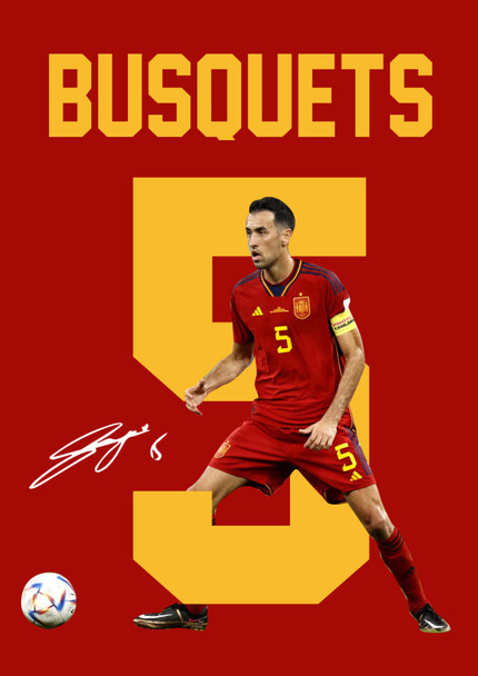 Celebrate the intelligence and composure of Sergio Busquets with this Signed Poster Print, a striking tribute to Spain's legendary midfield anchor and captain. Captured in full national kit with the number 5 and a dynamic in-game pose, this poster reflects Busquets' tactical brilliance, calm leadership, and historic role in Spain's golden generation.